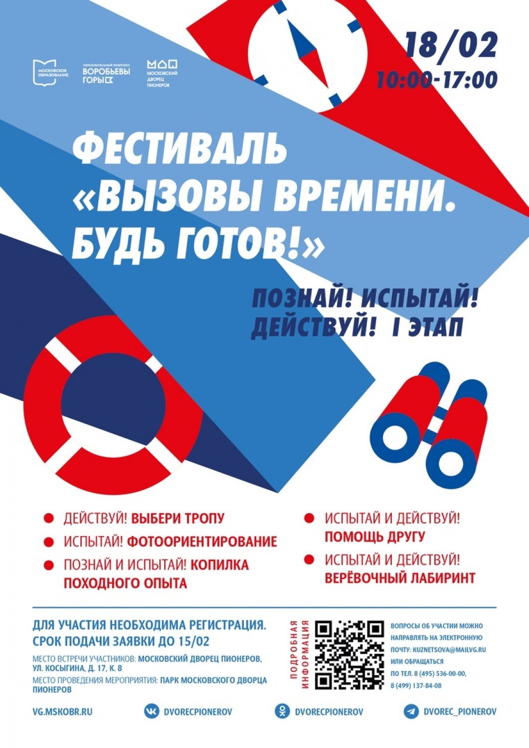 Фестиваль «Вызовы времени. Будь готов» пройдет 18 февраля в рамках первого этапа проекта «Познай! Испытай! Действуй!». Участники встретятся в 10.00 по адресу: ул. Косыгина, д. 17. Необходимо регистрация по ссылке.