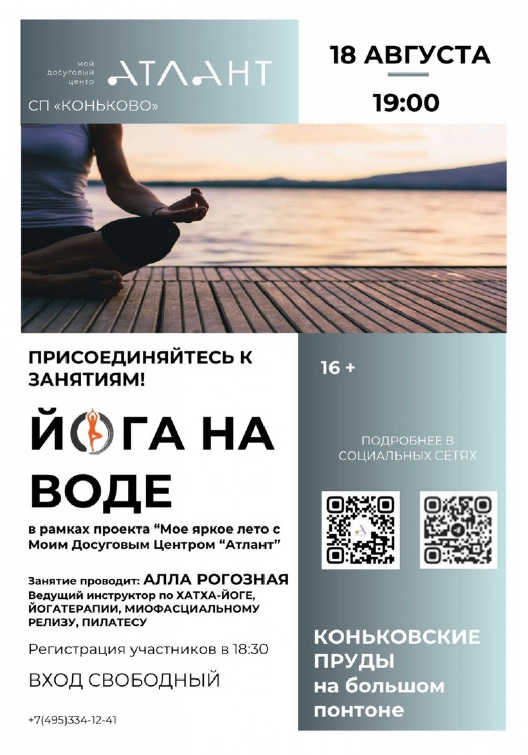Регистрация на мастер-класс «Йога на воде» начнется в 18.30. Участники встретятся на понтоне на территории Коньковских прудов по адресу: ул. Введенского, д. 26. Благодаря занятию можно снизить уровень стресса, а также проверить гибкость тела. Кроме того, тренер поможет настроиться на волну спокойствия.