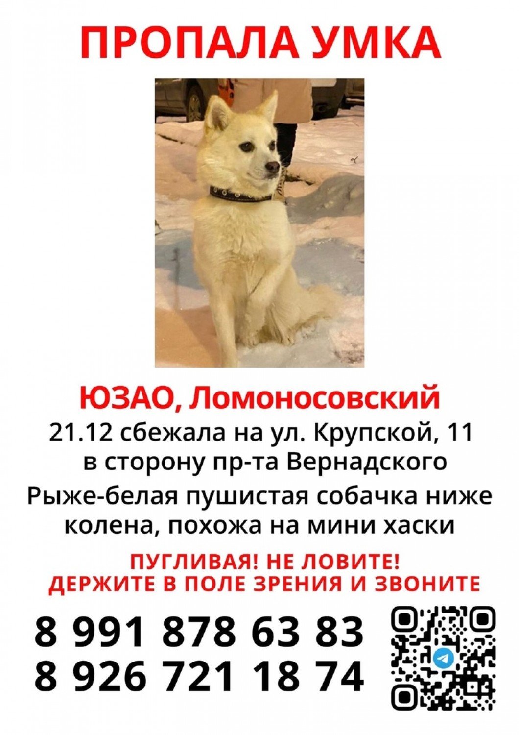 Отмечается, что Умка пуглива, поэтому нашедшего собаку просят не ловить ее, а сообщить по телефонам: 8-991-878-63-83 и 8-926-721-18-74.