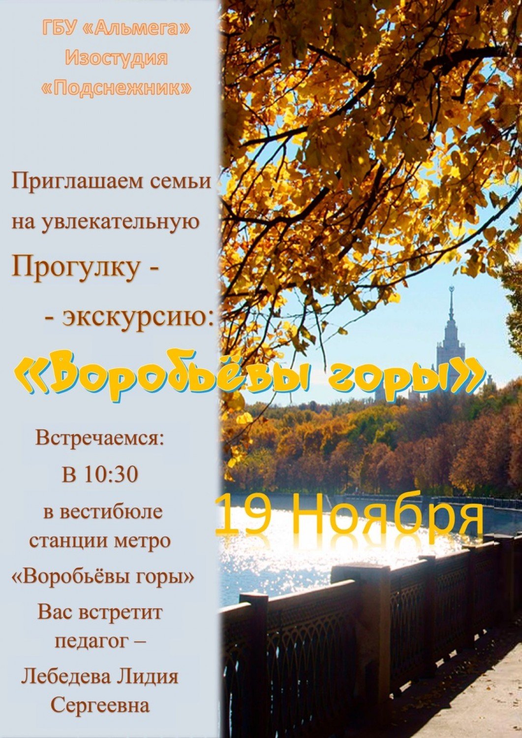 Поучаствовать в экскурсии «Воробьевы горы» могут семьи и все желающие. Ее проведет руководитель изостудии «Подснежник» Лидия Лебедева.
