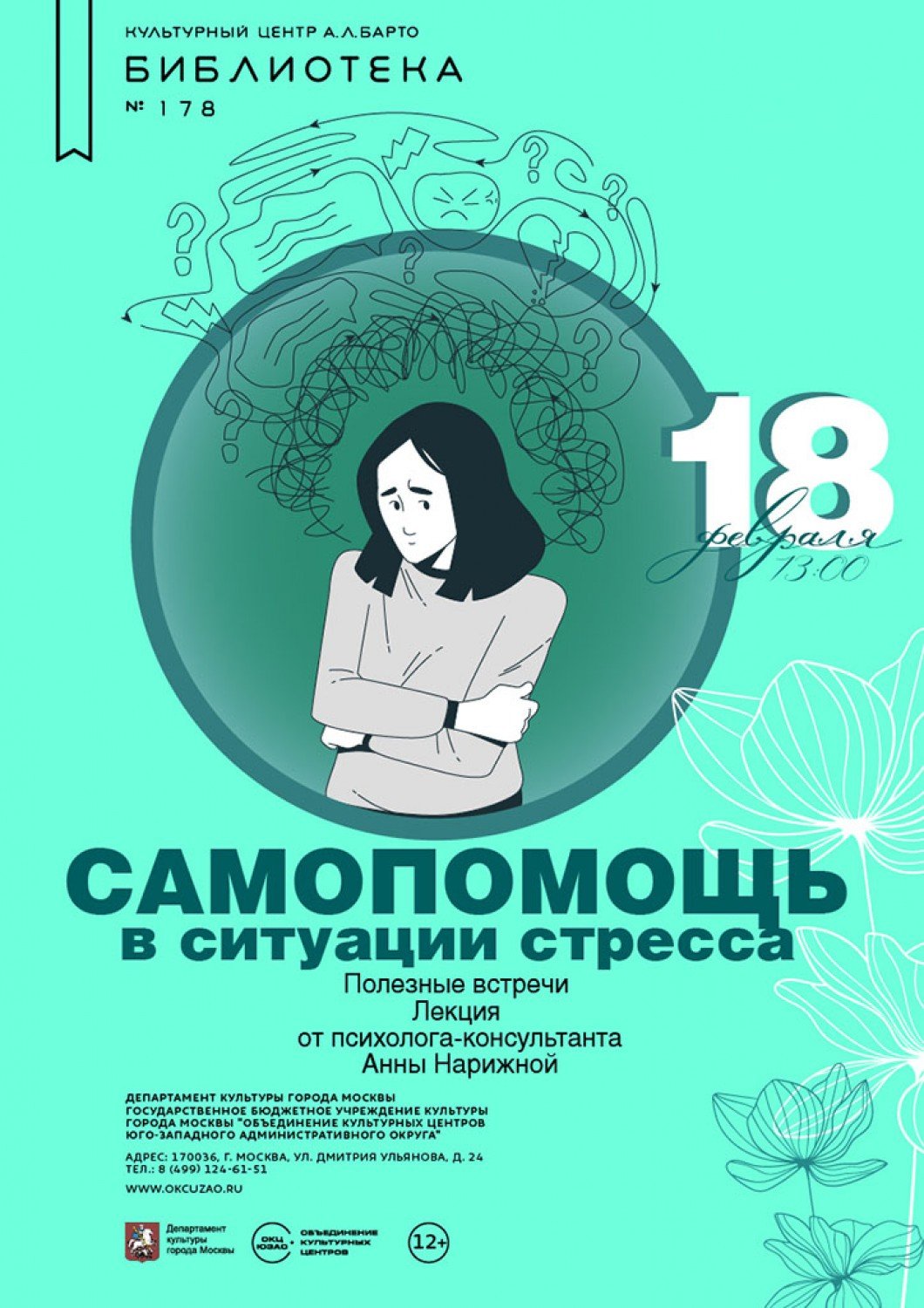 Встречу «Самопомощь в ситуации стресса» проведет профессиональный психолог-консультант Анна Нарижная. Как сообщается на сайте Объединения культурных центров ЮЗАО, специалист объяснит, как найти баланс между работой и личной жизнью. Также будут разобраны особенности психического склада, которые нужно учитывать при выходе из стресса.