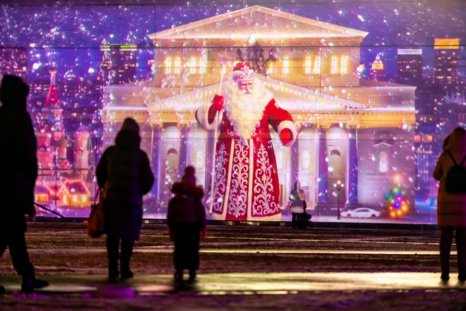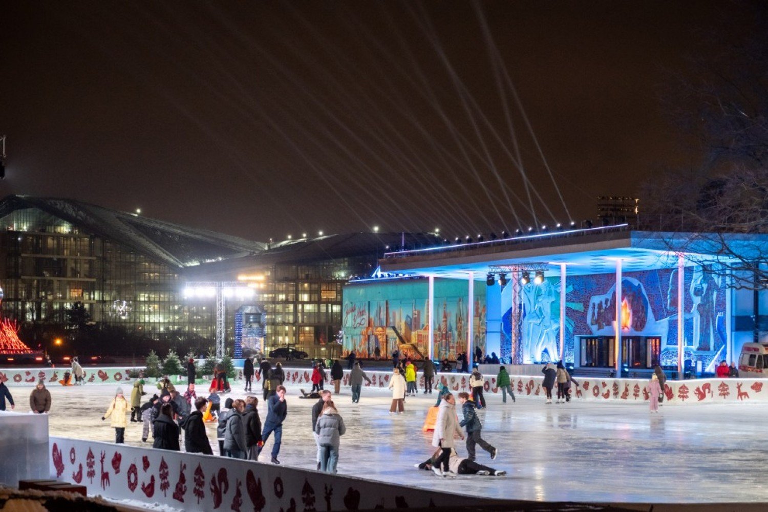 Возле Дворца пионеров на Воробьевых горах традиционно вырос целый зимний город. Масштабы впечатляют: для горожан доступен каток площадью более 4000 кв. м, а фасад здания украшает мультимедийное шоу.