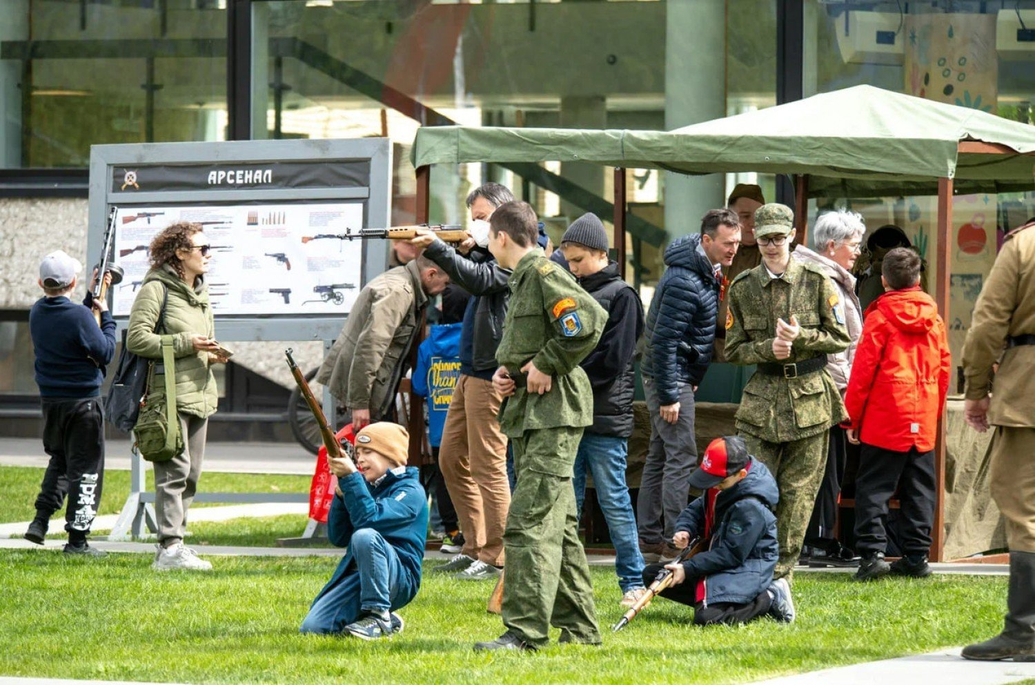 Дворец пионеров в честь 80-летия со Дня Победы устроил для жителей юго-запада Москвы незабываемый праздник. Посетители смогли ознакомиться с оружием, которое помогло одержать победу в Великой Отечественной, попробовать настоящую солдатскую кашу и посмотреть на выступления артистов - воспитанников дворца.