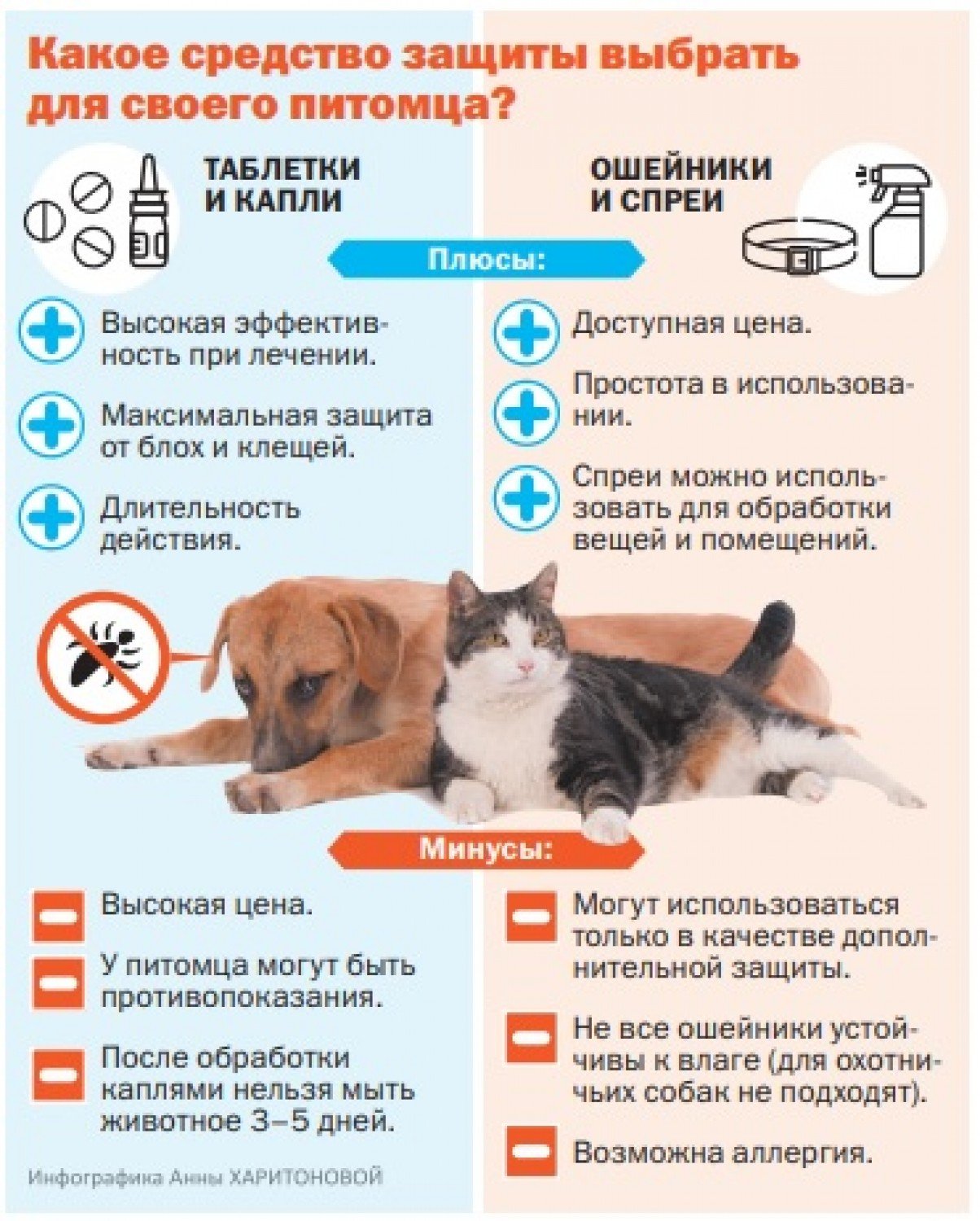 «Стопроцентную защиту дают только таблетки, – уверена Елена Сахарова. – После приёма лекарства в крови животного вырабатываются антитела, которые при укусе клеща спасут питомца от заражения». Однако таблетки не всегда подходят при хронических заболеваниях животных. В этом случае лучше использовать более лёгкие препараты-отпугиватели (спреи, капли и ошейники).