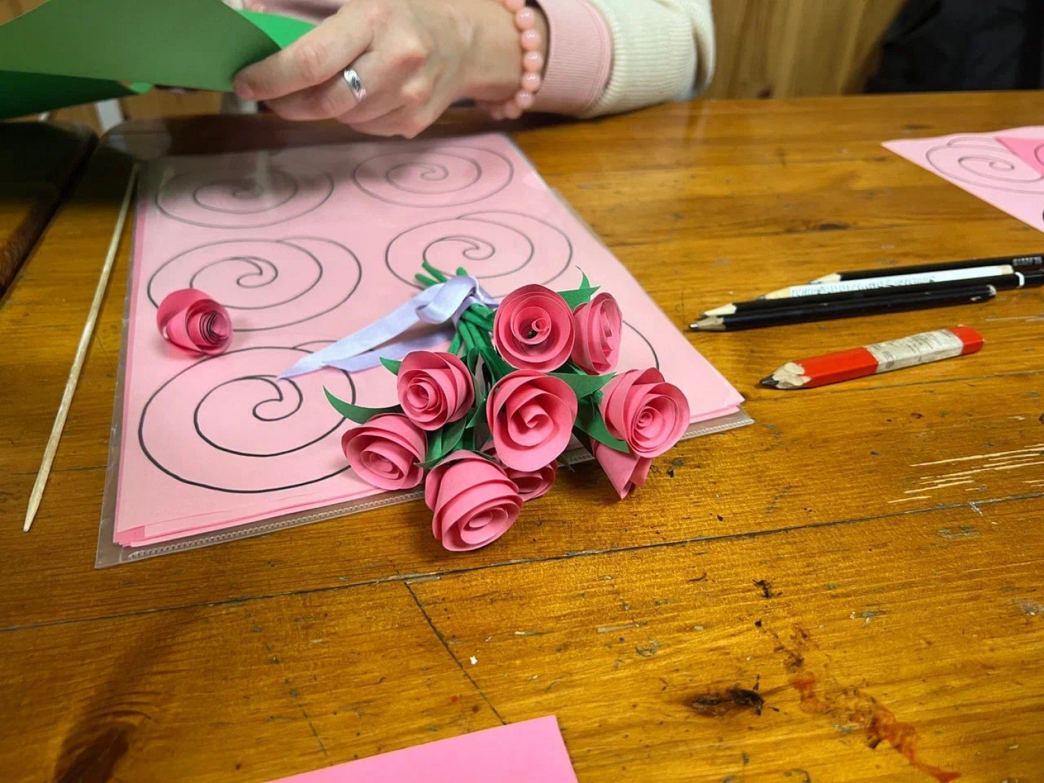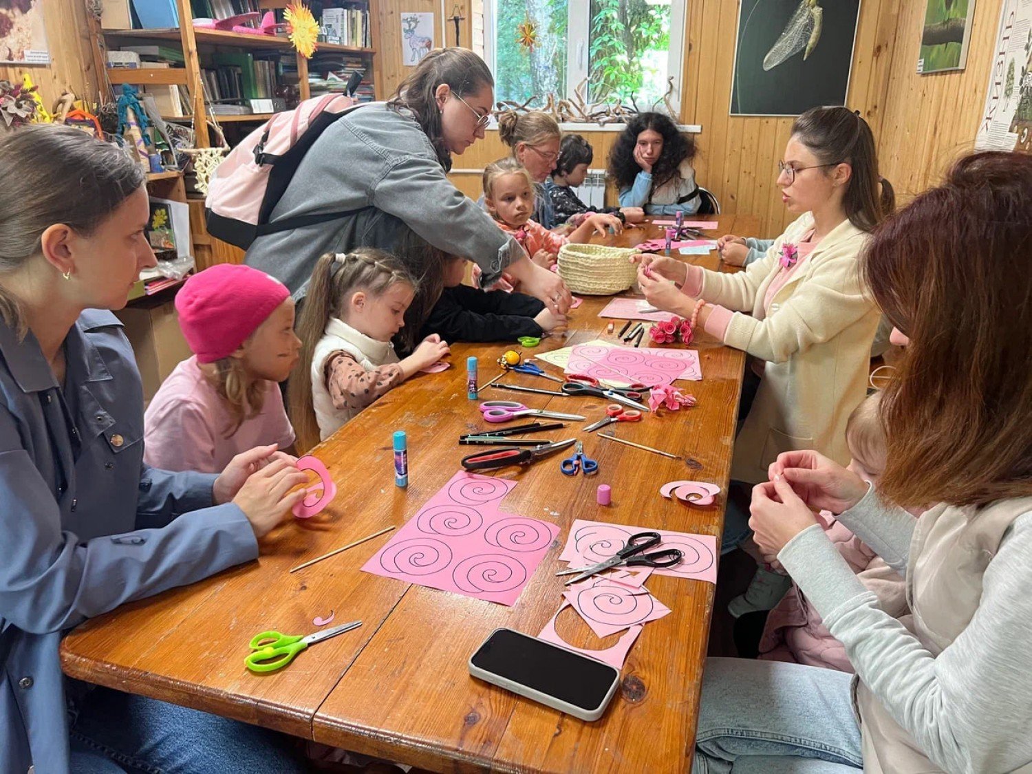 Внутри экоцентра организовали мастер-класс по изготовлению розочки из бумаги. Все дети ушли со своим личным букетом, который можно приколоть на одежду, как брошь.