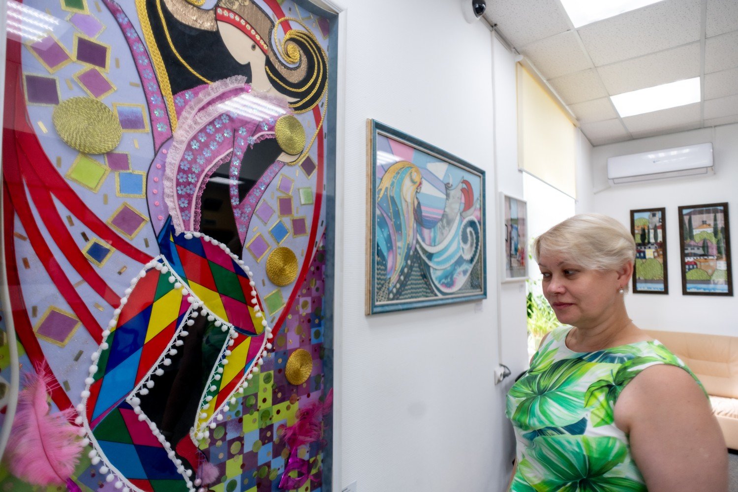 «У нас представлены работы, выполненные в лоскутной технике, из ткани и кожи, украшенные тесьмой, пайеткам и бисером. Эти материалы наверняка найдутся в доме у каждой хозяйки, из них можно создавать не только аксессуары, но и картины», – рассказала Елена Свиридова, куратор выставки и руководитель галереи.