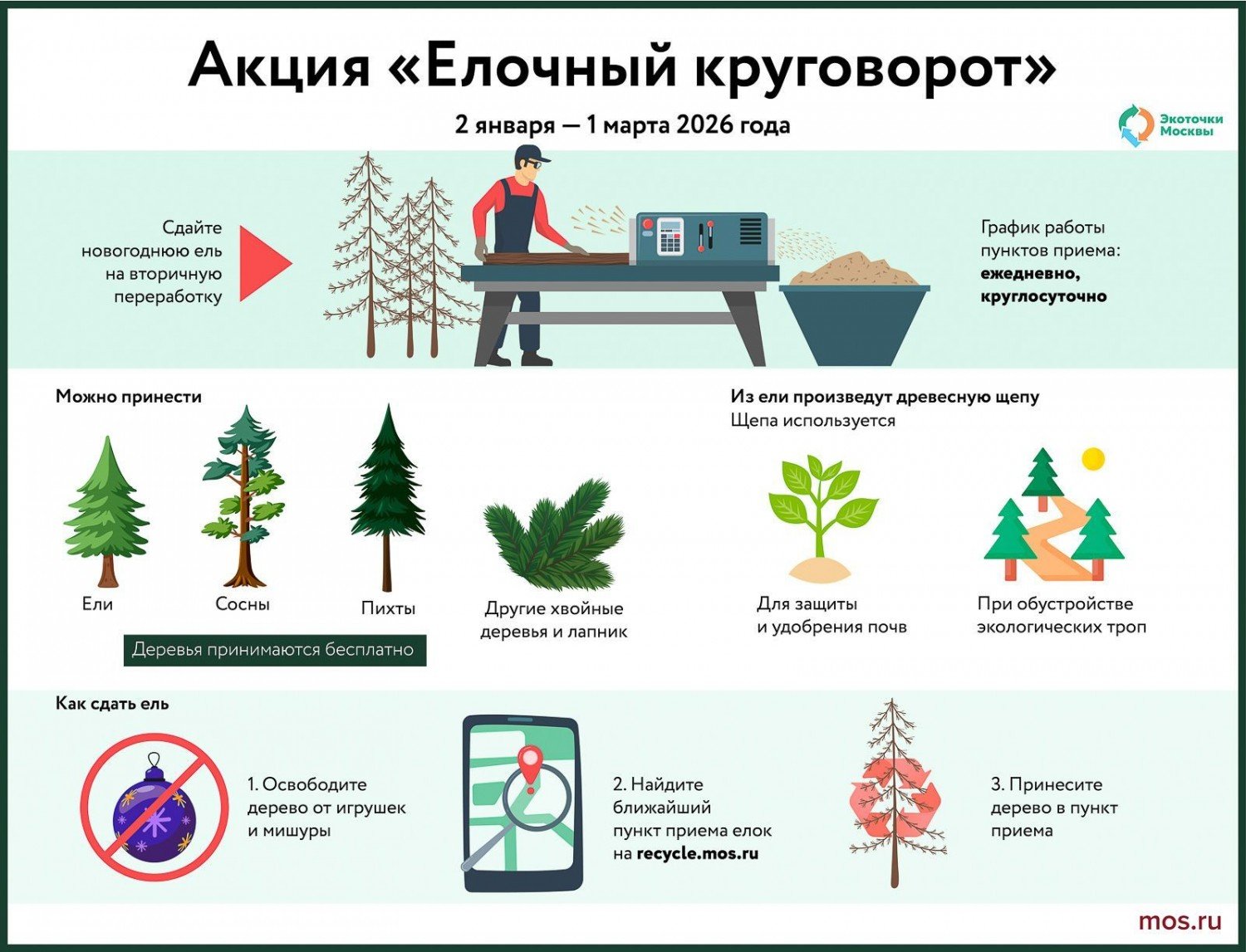 С 2 января по 1 марта 2026 года в Москве работают сотни пунктов приема — экоточек. Они открыты круглосуточно во всех округах, включая ЮЗАО. Найти ближайший к дому пункт проще всего на карте спецпроекта «Экоточки Москвы» или на сайтах префектур.