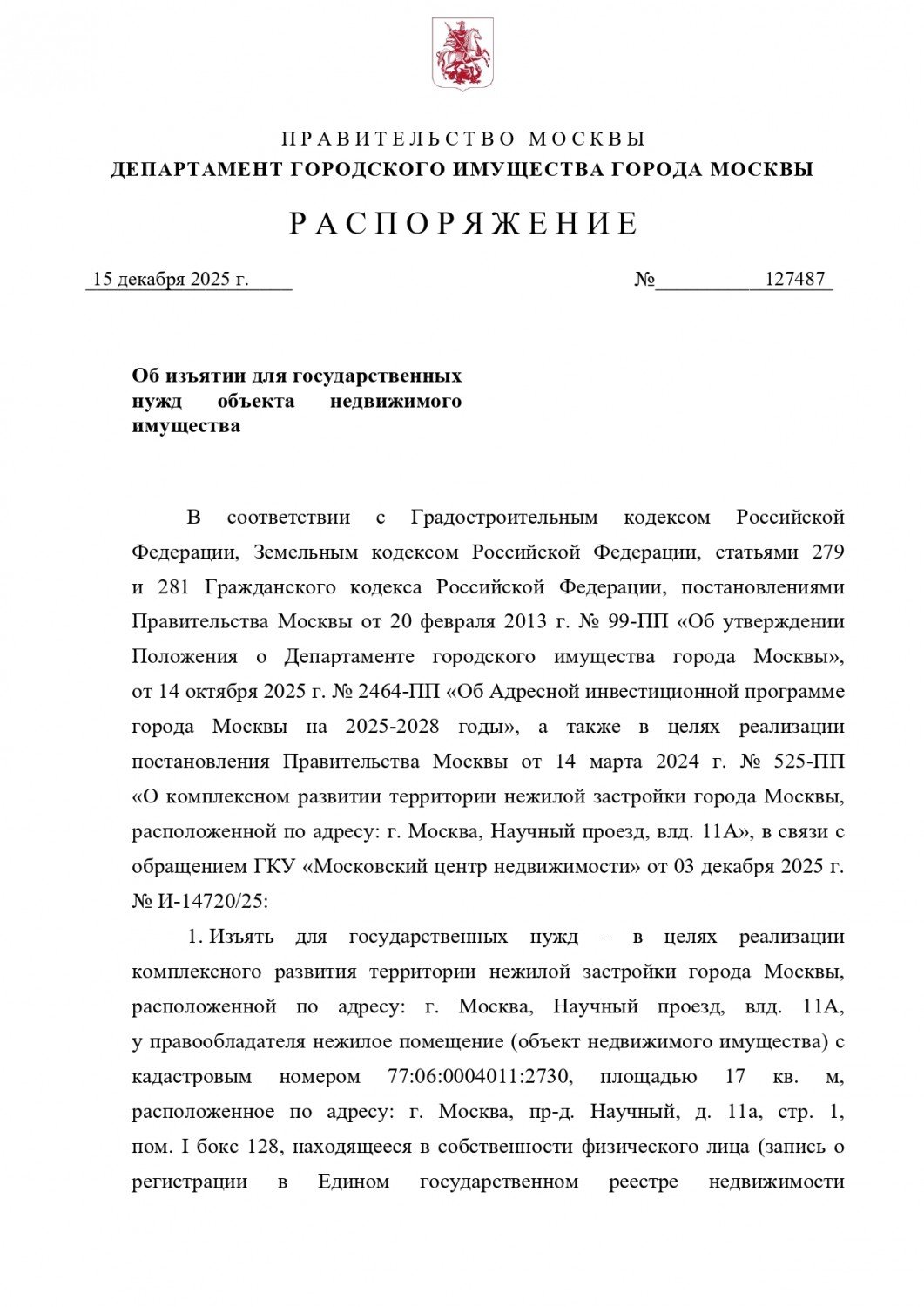 Об изъятии для государственных нужд объекта недвижимого имущества