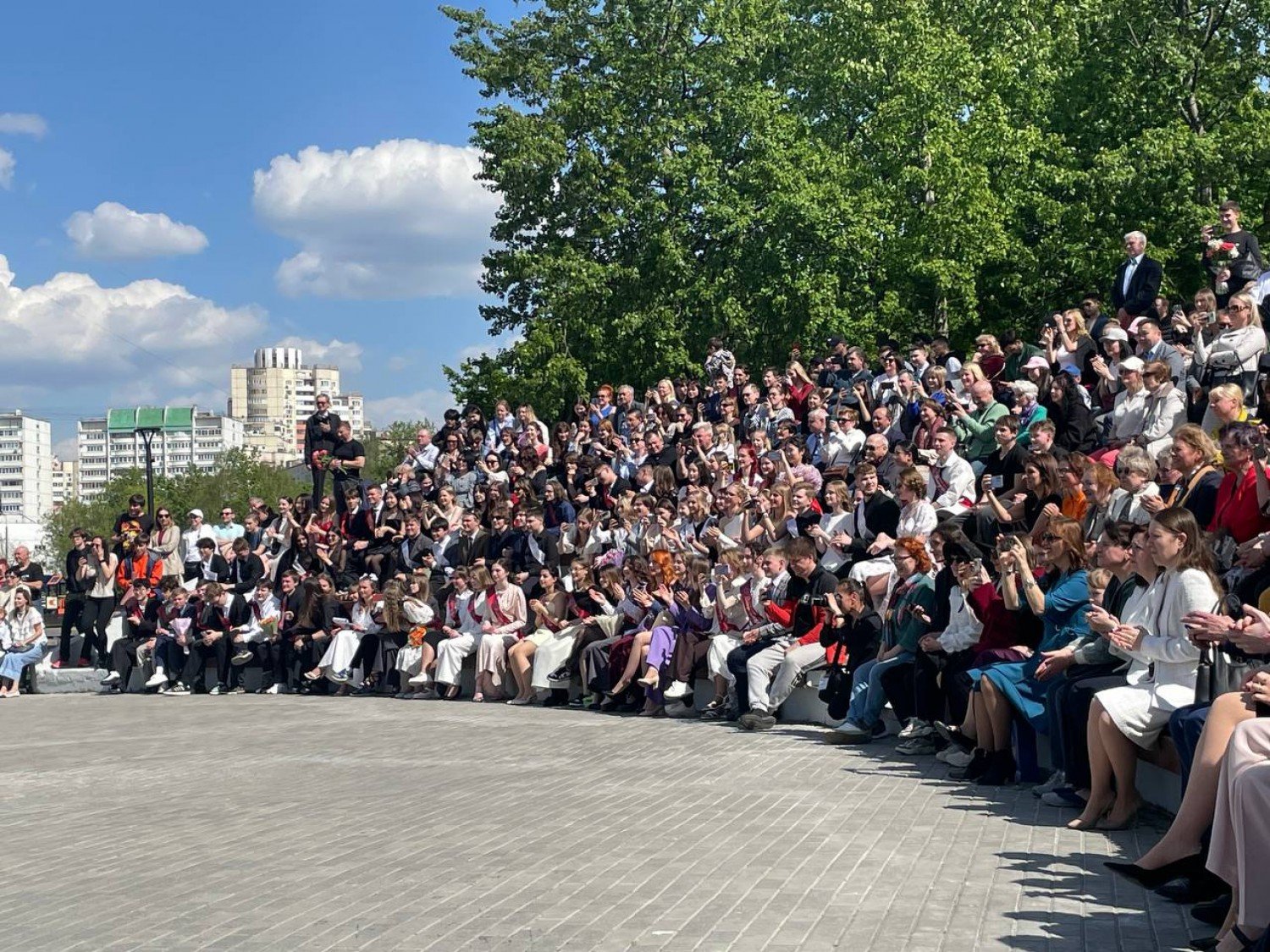 А уже вскоре к празднику подтянулись все желающие. Ведь сцена с амфитеатром у прудов – это свободная зона. Поэтому поглядеть на выпускников решили и жители соседних домов, и любители активного отдыха, которые обычно катаются на велосипедах по парку. Поэтому 11-классникам предстояла трудная задача: сделать праздник интересным не только для своих, но и для местных жителей.