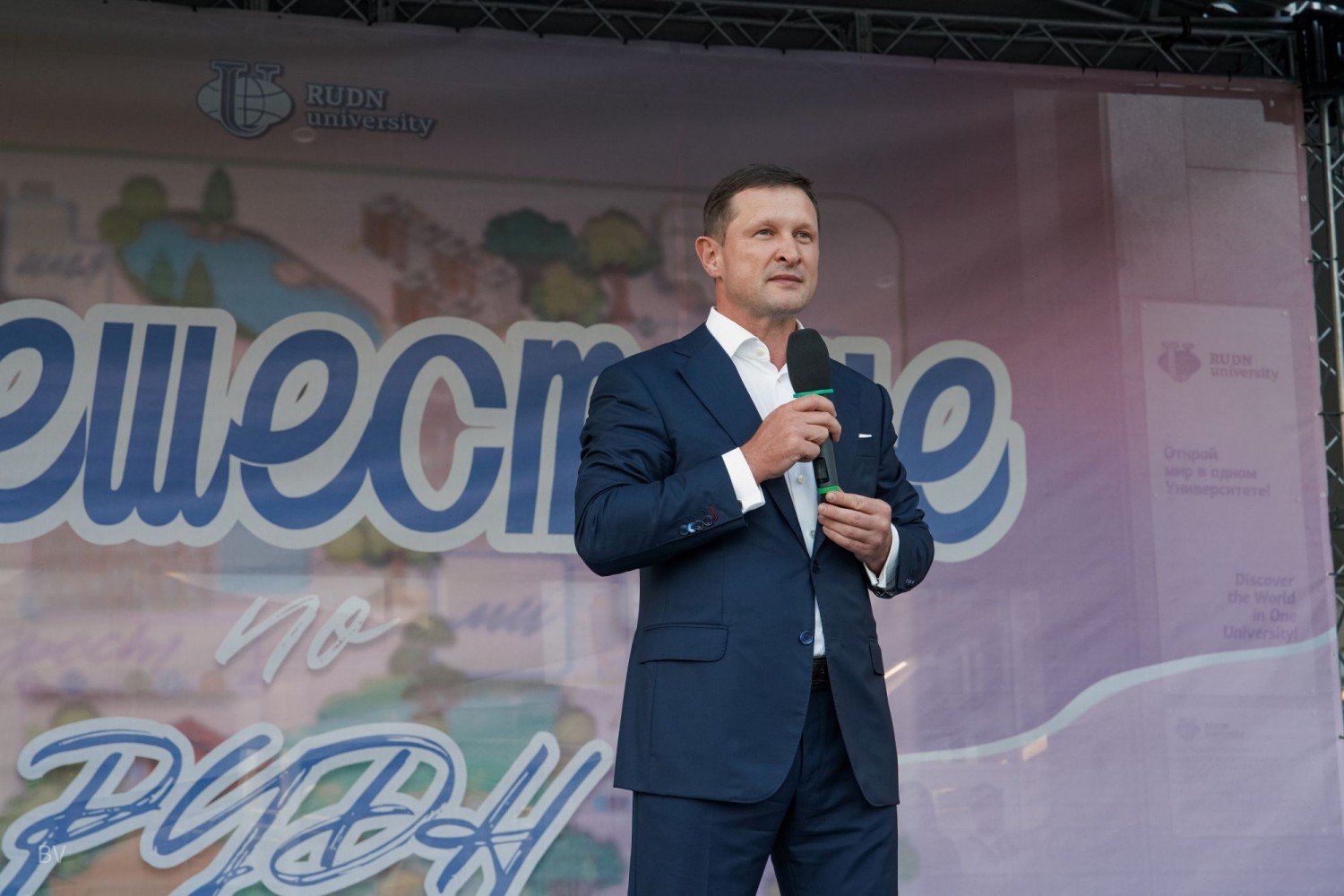 «День знаний в новой альма-матер останется с вами на всю жизнь. Я поздравляю вас с поступлением одного из лучших вузов не только России, но и мира. Выпускники которого есть во всех без исключения странах. Вы открыли эти двери упорством, талантом, знаниями. У нас университет возможностей — пользуйтесь ими! У вас будут потрясающие преподаватели. Занимайтесь спортом, волонтёрством. Знакомьтесь — в вашей записной книжке будут друзья из 170 стран мира. Желаю успехов, в добрый путь, ребята!» — сказал ректор РУДН.
