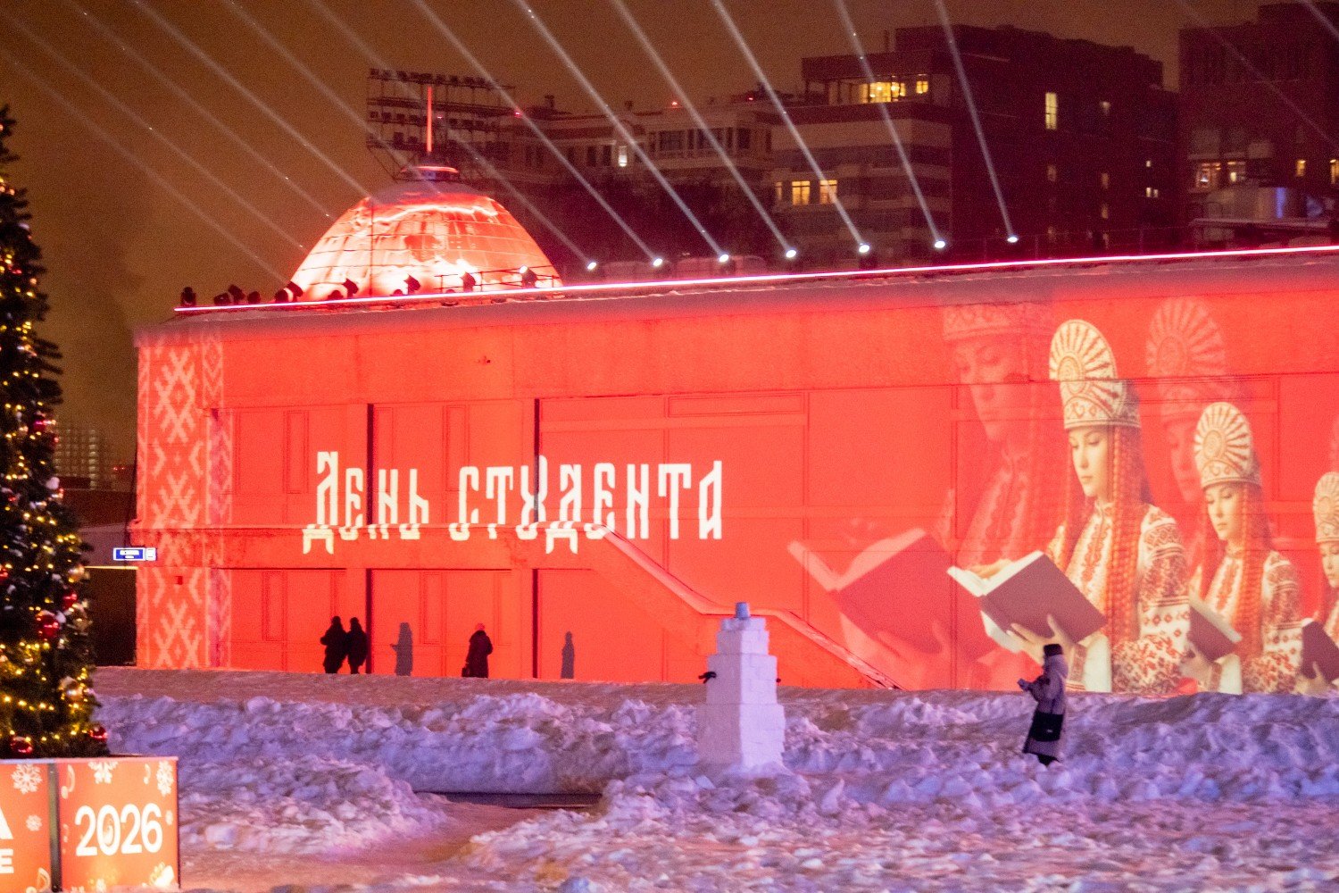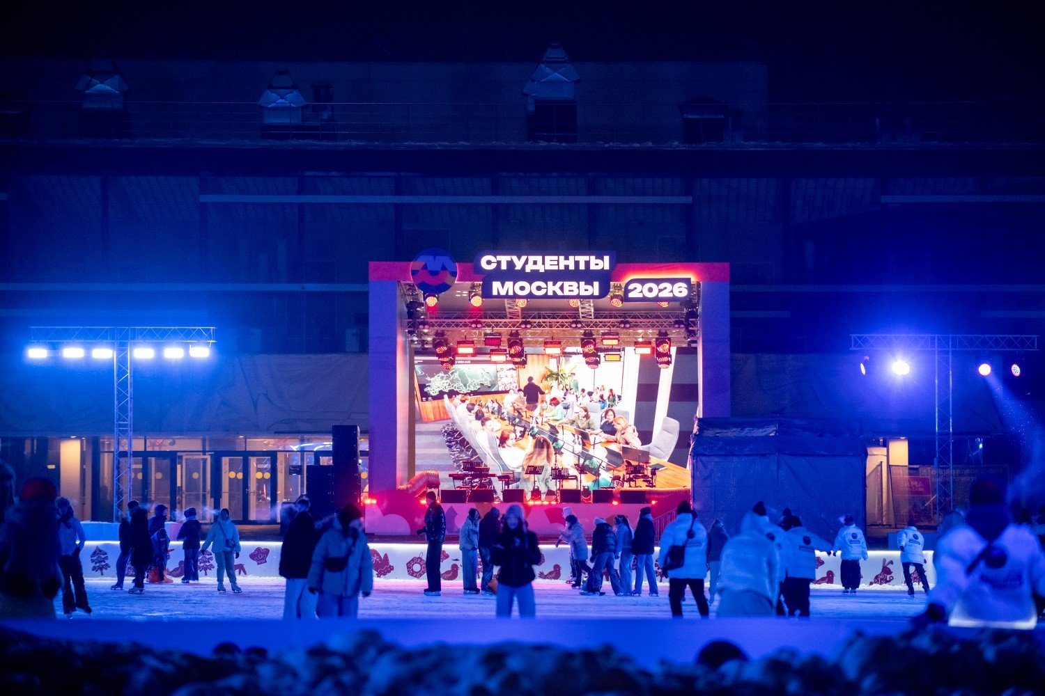 На катке в это время развернулась дискотека на льду, которая плавно перетекла в масштабную музыкальную программу. После активного отдыха гостей ждал концерт от оркестра «СимфоМультиМедиа». Но на этом сюрпризы не закончились — как только стемнело, на фасад Дворца вывели праздничную видеопроекцию.