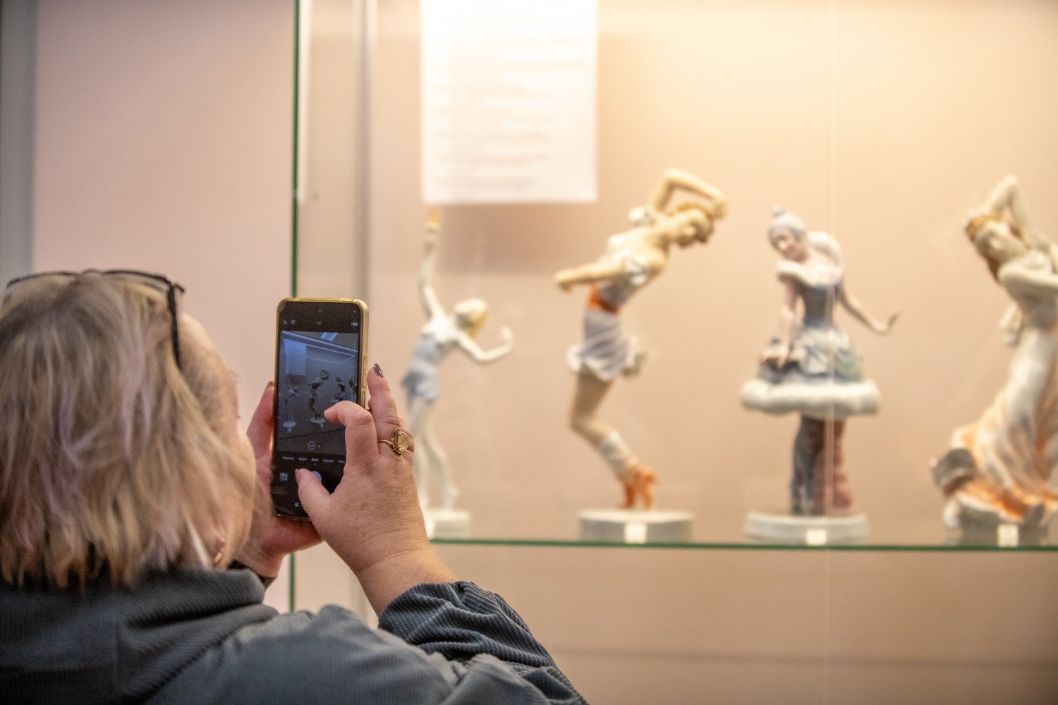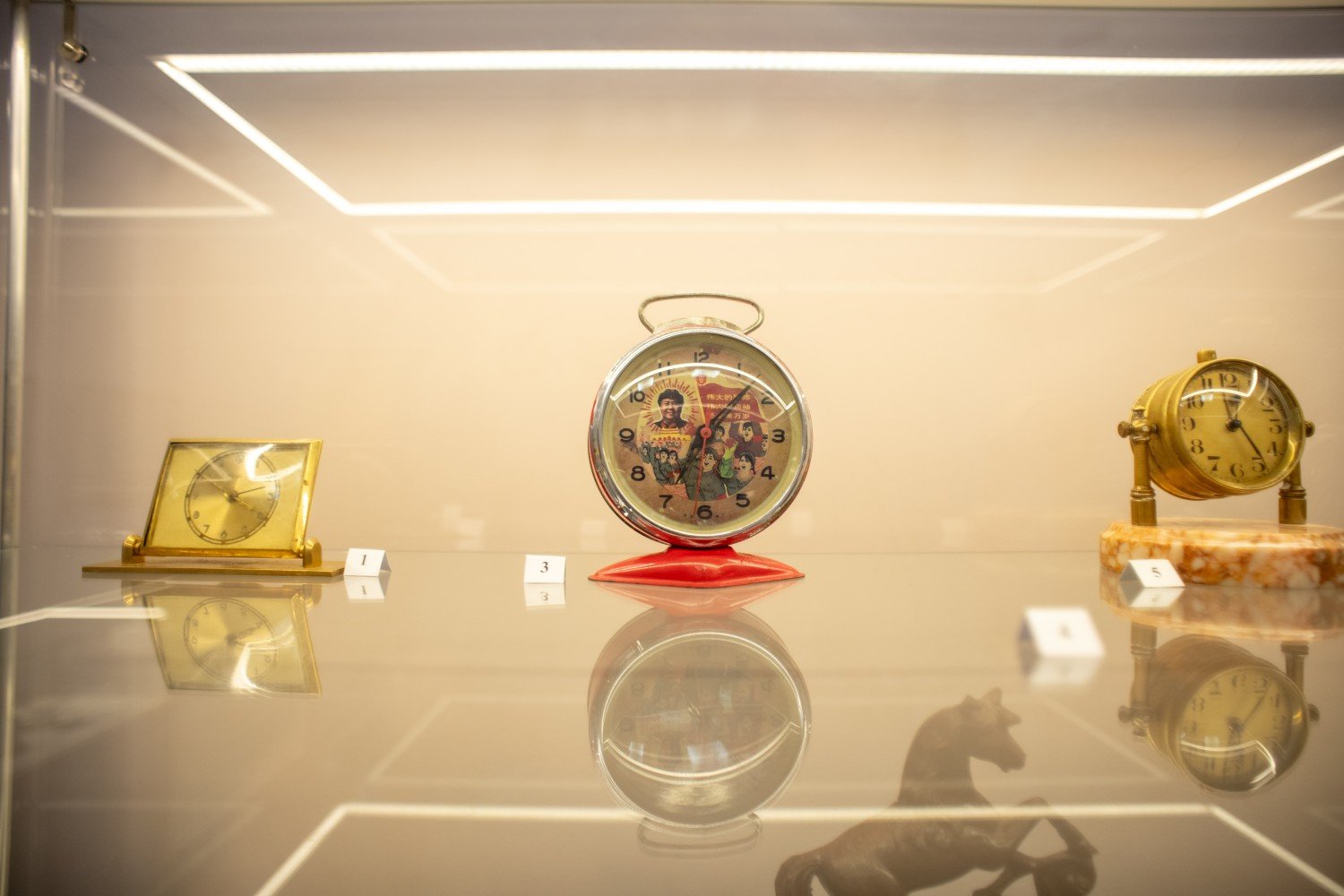 Рядом замерли в изящных позах фарфоровые балерины в стиле ар-деко из собрания Елены Макаркиной и Аллы Демидовой. А по соседству тикают и готовы исполнить мелодию деревянные будильники 80-х годов из коллекции Альберта Сердюка.