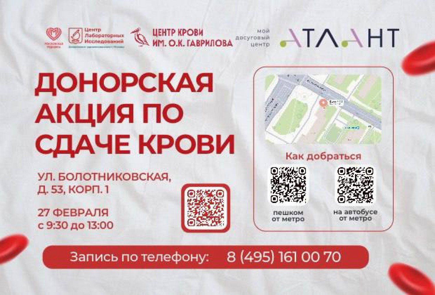 В конце февраля у жителей юго-запада столицы появится возможность совершить поступок, который может спасти чью-то жизнь. 27 февраля по инициативе ГБУ «Атлант» и при поддержке медицинских специалистов в районе Зюзино состоится акция по сбору донорской крови.