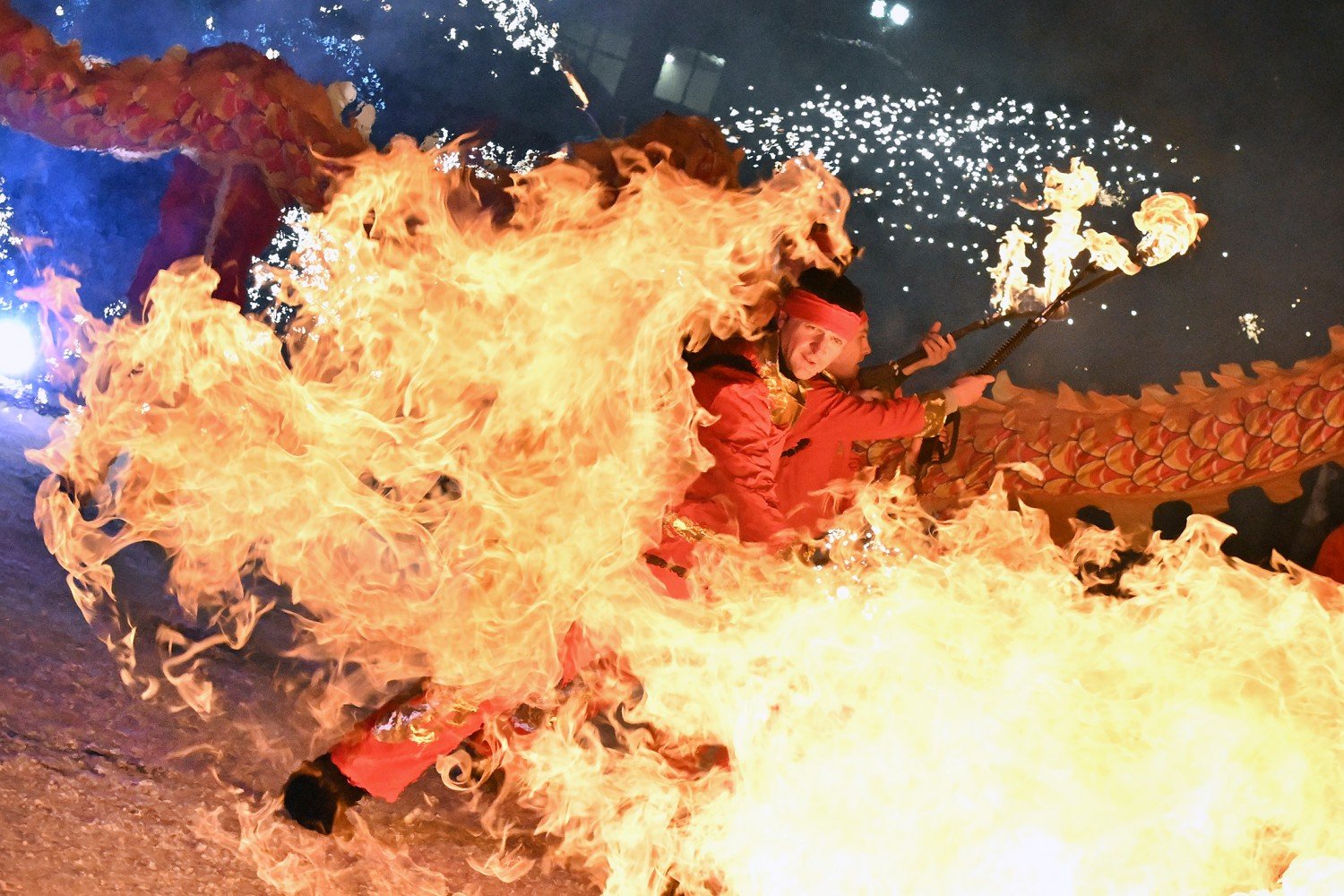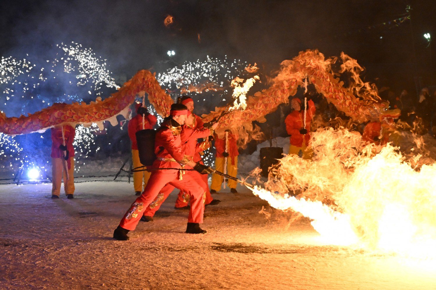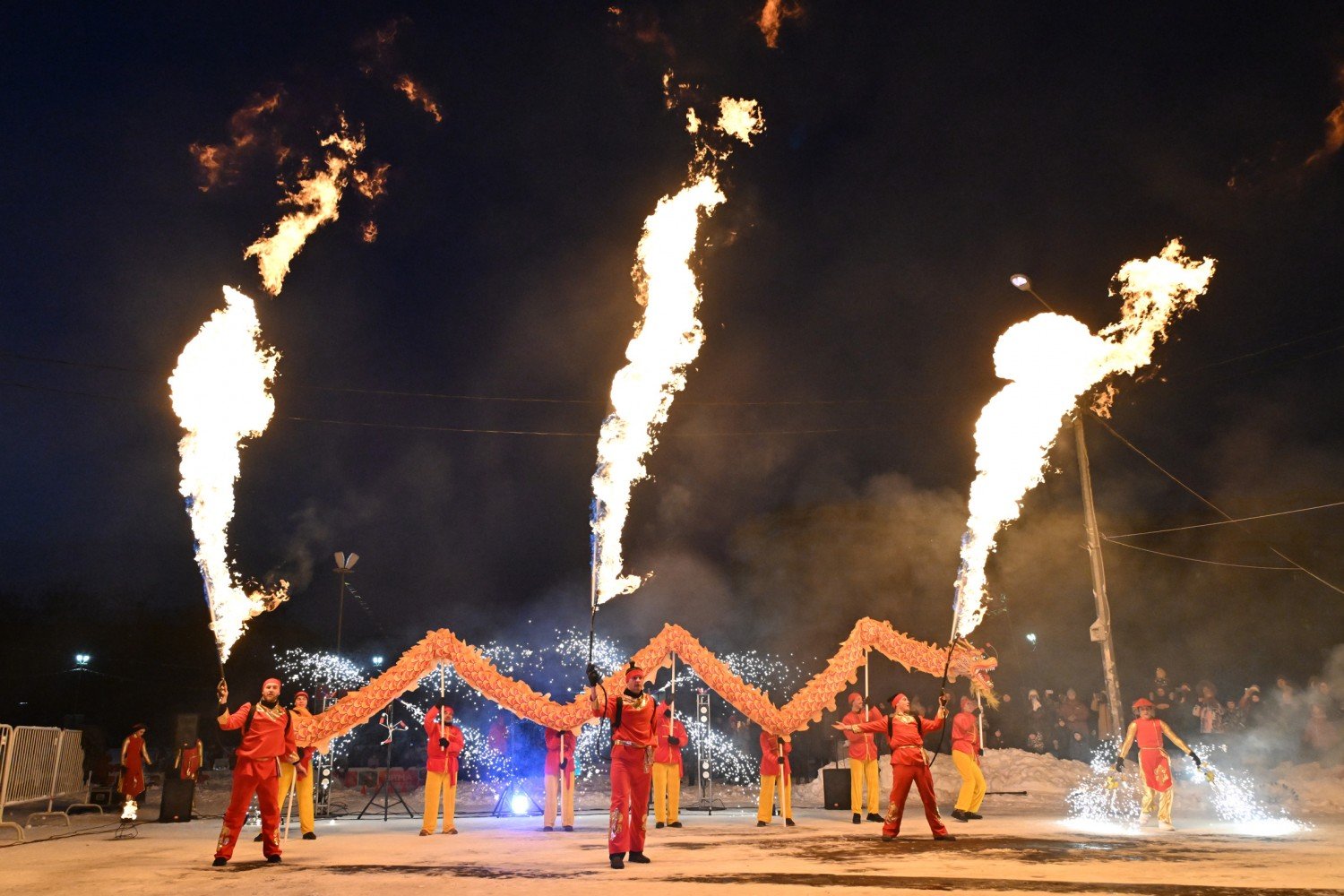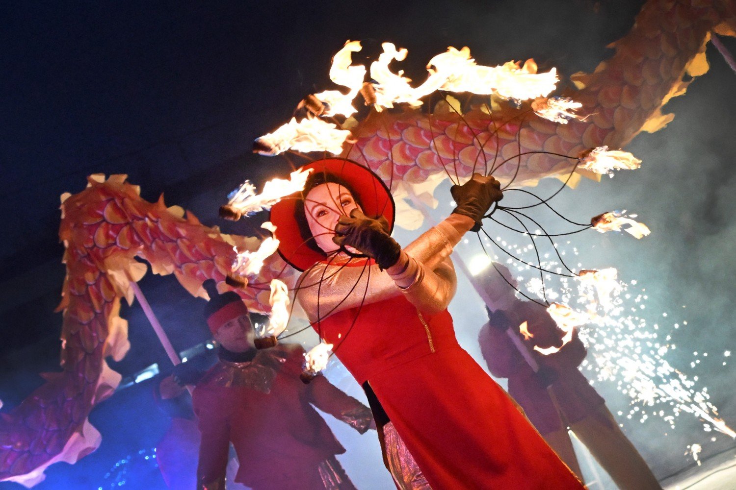 Демонстрация символа года плавно перетекла в кульминацию вечера — завораживающие танцы с огнем. В руках мастеров вращались веера, посохи и шесты с фитилями на концах. Горячее представление дополнили пиротехническими спарклами — фонтанами холодных искр, которые создавали вокруг танцоров сияющий ореол. Под народную музыку исполнители сменяли реквизит один за другим, не давая зрителям заскучать ни на секунду.