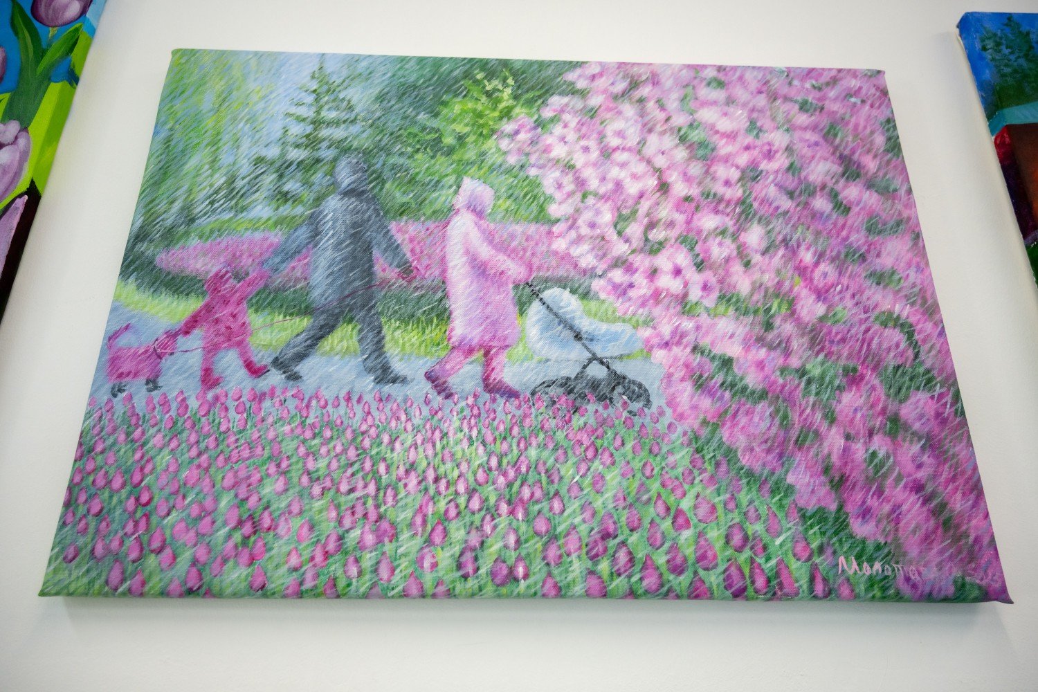 Так родились уникальные работы, балансирующие на грани наивного искусства, лубка и даже импрессионизма. Например, в картине «Майский снег» борьба зимы с весной передана через легкие, трепетные мазки. По заснеженным тюльпанам прогуливается «розовая семья», где даже собака одета в розовый комбинезон.