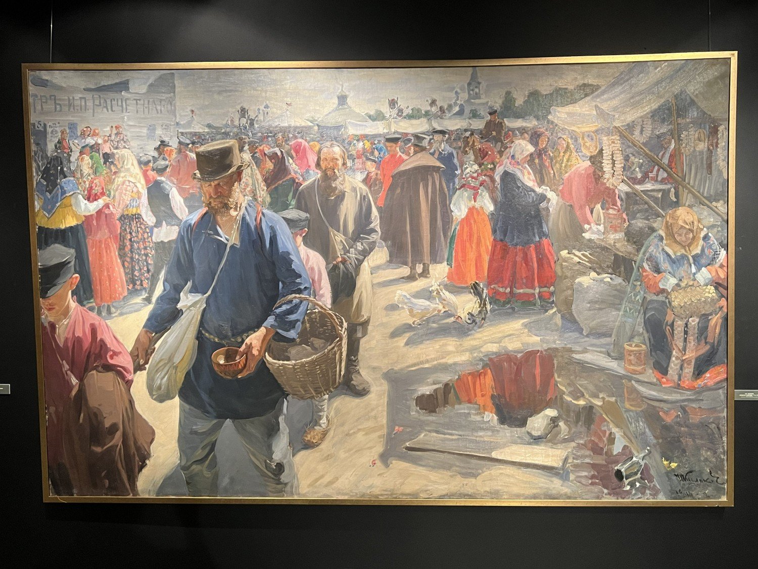 Центральное место в экспозиции занимают сцены из крестьянского быта. Полотно «Зимним вечером» показывает уютные женские посиделки в избе, а на «Крестьянской пирушке» за столом собралась большая дружная семья. На картине «Ярмарка» можно в деталях рассмотреть деревенскую лавку 1910 года с ее нехитрым товаром: лаптями, игрушками, посудой и тканями. Поразительной красоты наряды крестьянок вызывают восхищение и легкую грусть об ушедшей традиции носить русский национальный костюм.