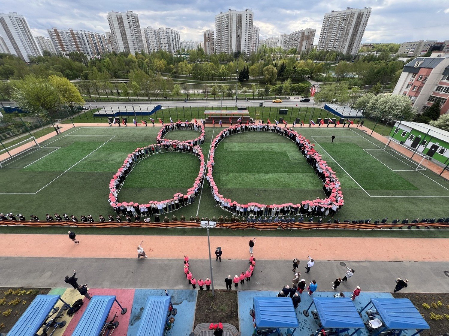 Управа района Северное Бутово при содействии Моего досугового центра «Атлант», который в эти дни проводит праздничные мероприятия в честь 80-летия Победы во всех районах юго-запада Москвы, 25 апреля организовала зрелищный флешмоб на территории спорткластера по улице Ратной. В акции приняли участие 500 местных жителей, которые выстроились на поле в форме числа «80», а кадеты встали по периметру с георгиевской лентой в руках.