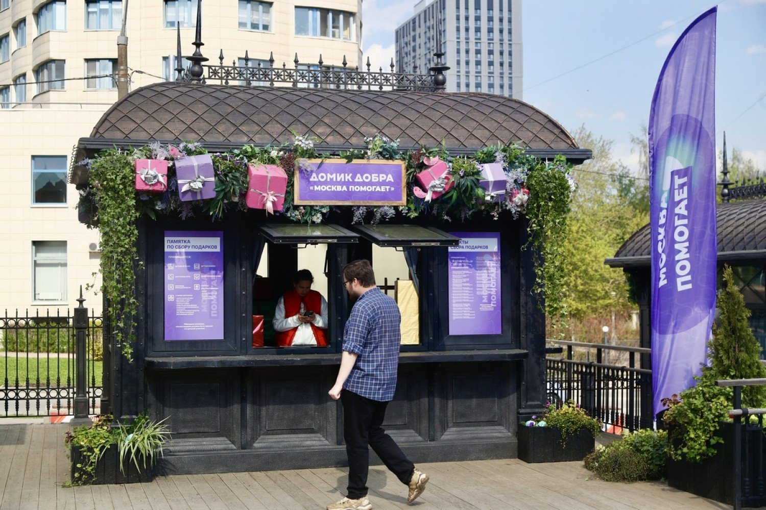 Работает на фестивальной площадке и шале «Москва помогает» - сюда можно приносить новые книги, игрушки, наборы со сладостями, предметы гигиены и одежду для участников СВО и детей, проживающих в новых регионах.